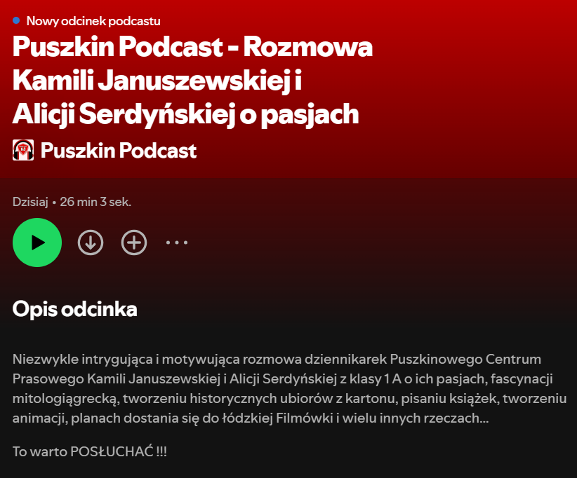 Niezwykle intrygująca i motywująca rozmowa dziennikarek Puszkinowego Centrum Prasowego Kamili Januszewskiej i Alicji Seredyńskiej z klasy 1 A o ich pasjach, fascynacji mitologią grecką, tworzeniu historycznych ubiorów z kartonu, pisaniu książek, tworzeniu animacji, planach dostania się do łódzkiej Filmówki i wielu innych rzeczach… To warto POSŁUCHAĆ !!!