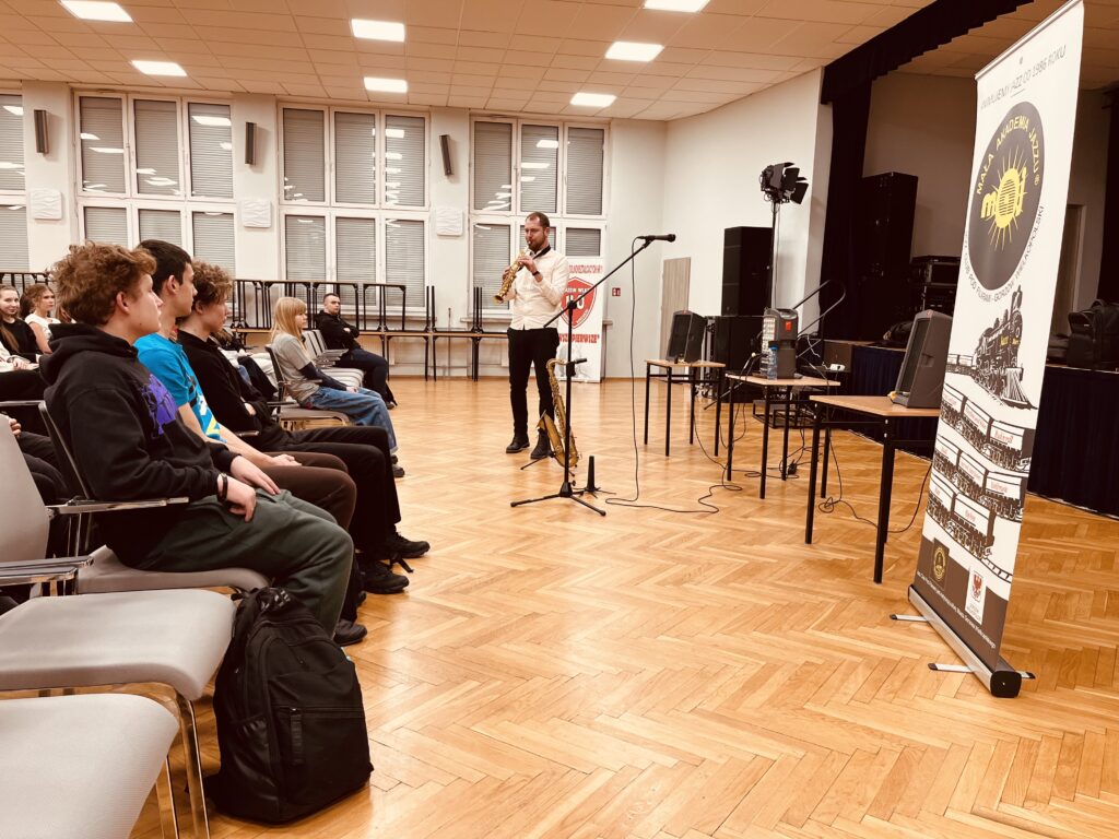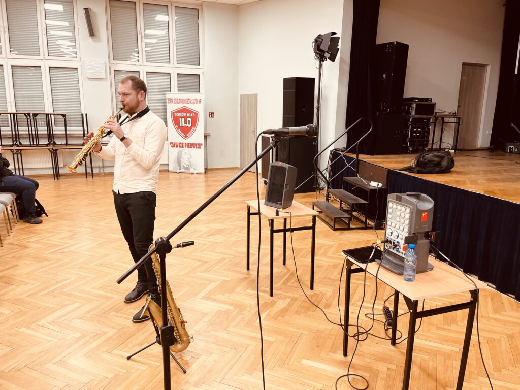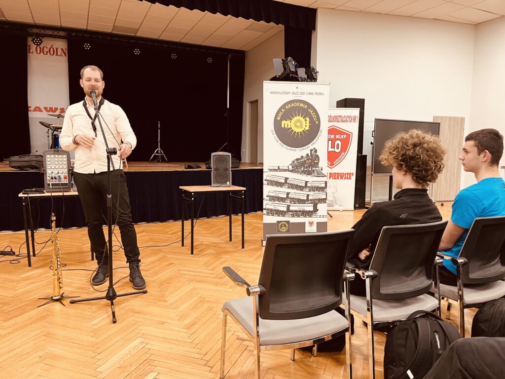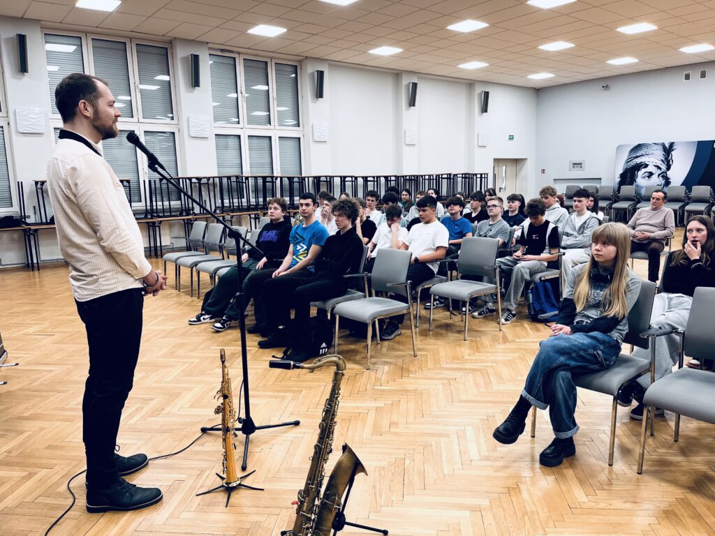 Zajęcia oparte były na kontakcie z uczniami – mniej teorii, więcej przykładów i współpracy. Uczniowie prędko wciągnęli się w ćwiczenia związane z rytmem, tworząc istną ucztę dla uszu, wyklaskując rytm w akompaniamencie saksofonu.