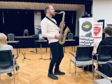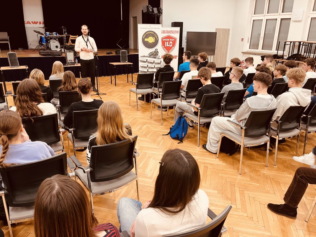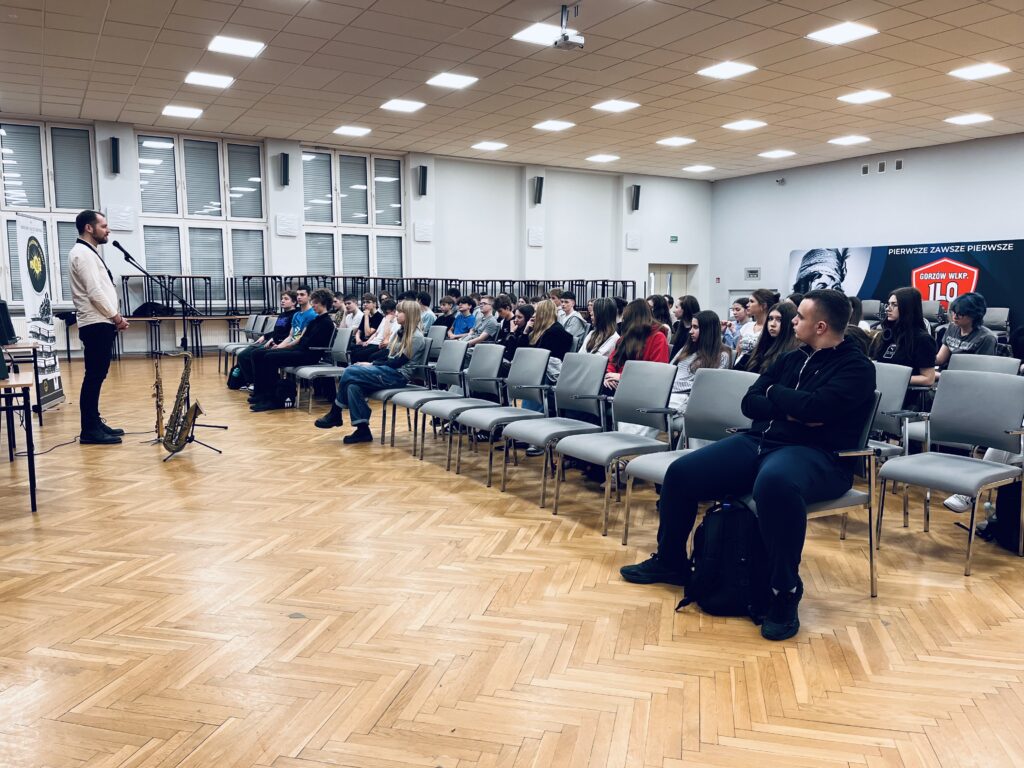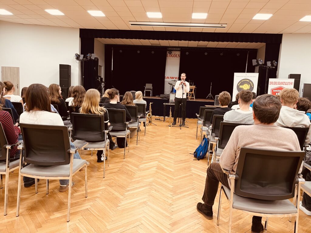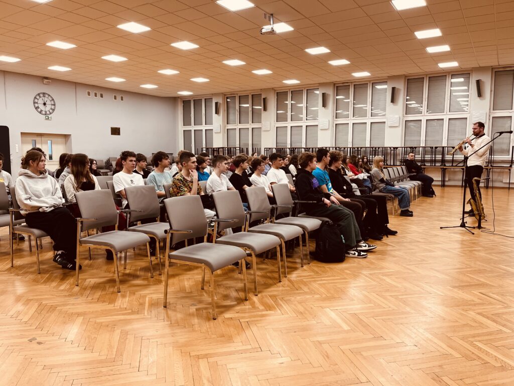 Zajęcia oparte były na kontakcie z uczniami – mniej teorii, więcej przykładów i współpracy. Uczniowie prędko wciągnęli się w ćwiczenia związane z rytmem, tworząc istną ucztę dla uszu, wyklaskując rytm w akompaniamencie saksofonu.